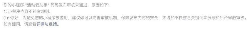 另外,如果你真的不想改变上面的内容,你可以尝试多次审核提交,因为微信小程序后台代码审核者,估计每次提交的人都不同,标准是治疗方法不同,审查可能会通过,但这是一种运气,仍然建议改进机制。