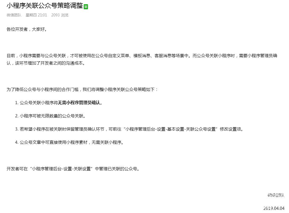 以前,小程序最多可以与500个公共号码相关联。这样的规则无疑是对小程序和公众号码的推广的一个主要限制。 小程序关联限制被破坏,小程序可以与更多公共号码相关联,这意味着更多。大量公共号码流量将直接指向小程序,与小程序关联的公共号码不需要小程序管理员确认,以进一步降低公共号码+ 小程序的链接操作阈值。
