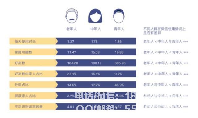 据报道,平均每日生活微信为1.37小时,仅比年轻人少0.49小时。 14.6%的老年人将联系人分组,2.7%的老年人在朋友圈内。会阻止家人。