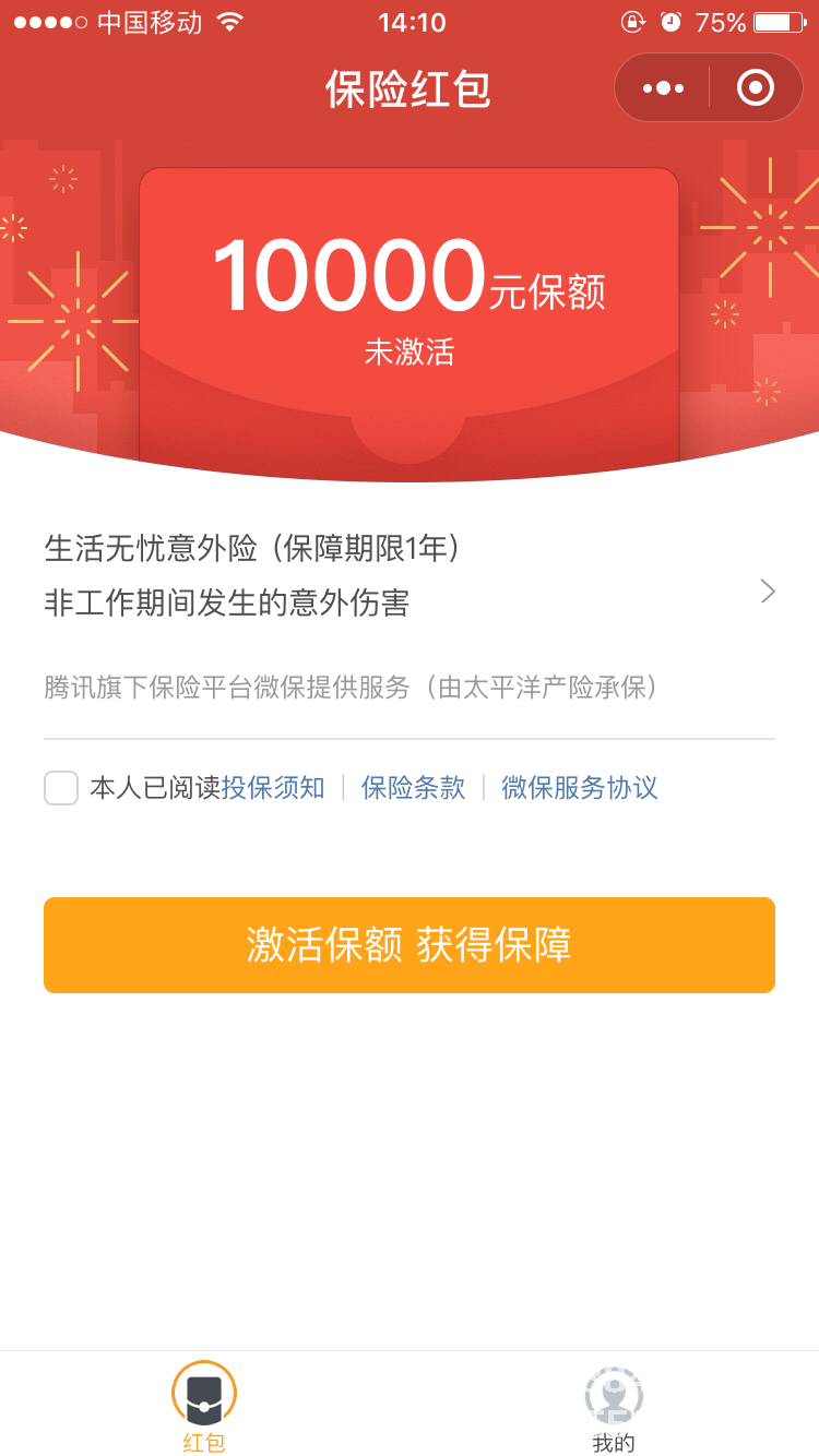 最近,腾讯微安全已悄然上线“保险红包”小程序。 微信用户第一次登录“保险红包”小程序,您将收到1万元一年无忧无忧意外保险〜